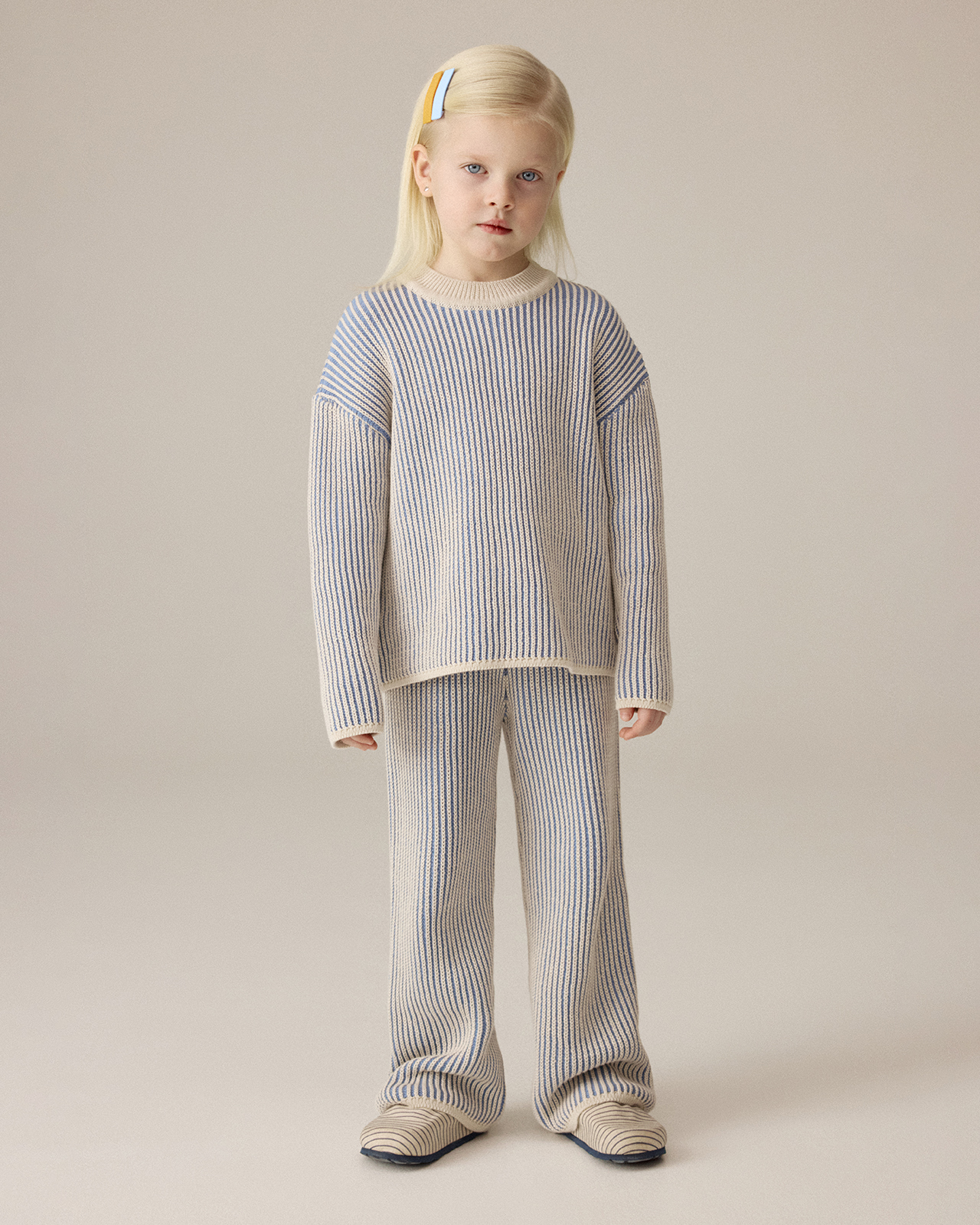Брюки легко вписываются в гардероб ребенка и сочетаются с любым верхом, но особенно — со свитером из комплекта.