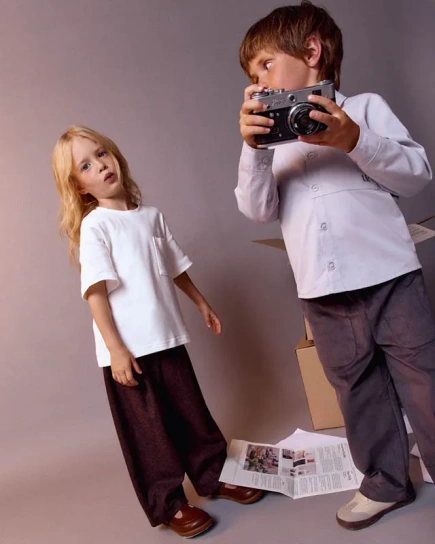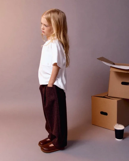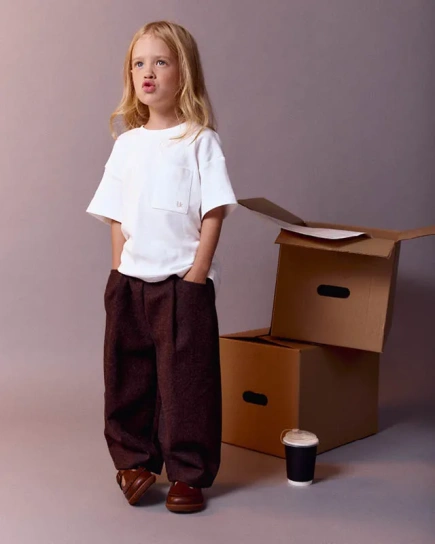 Базовая хлопковая футболка дополнена настоящим сокровищем — нагрудным кармашком. С ним хранить конфеты, ракушки и майского жука можно не у мамы в сумке, а прямо у сердца.