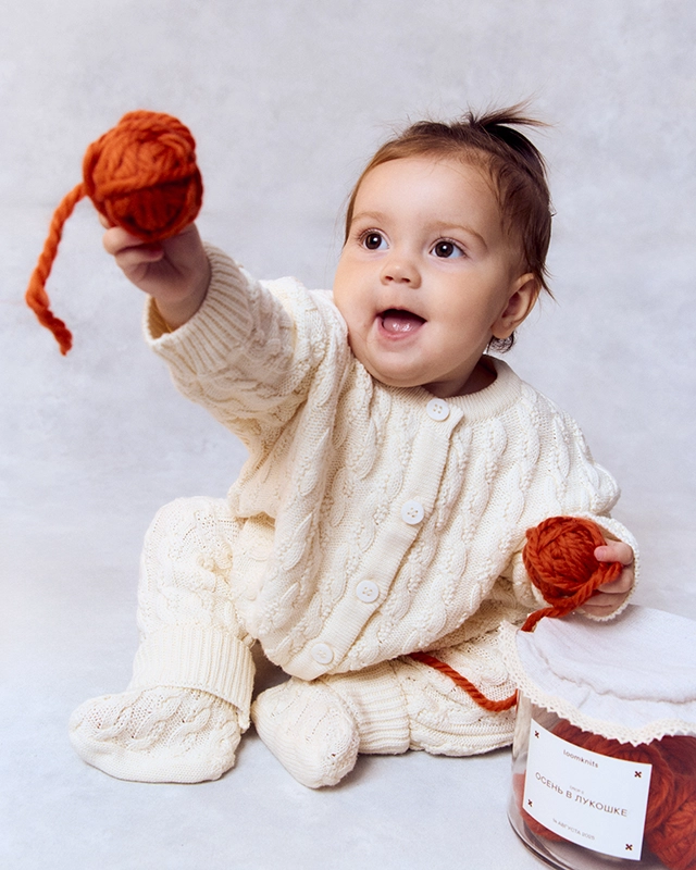 Оттенок молочной пенки смягчает нрав непогоды и настроение самых непоседливых малышей. А тактильно приятная шерстяная пряжа с хлопком настолько нежная, что может сравниться с пушистым облачком.