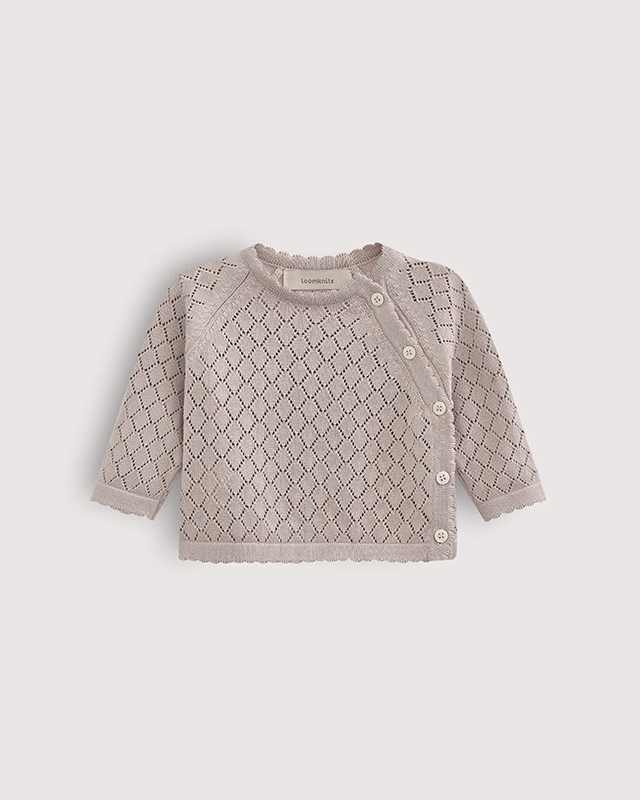 Боковая планка с пуговичками и просторная круглая горловина позволяют легко надевать и снимать кардиган, когда малышке нужно переодеться.