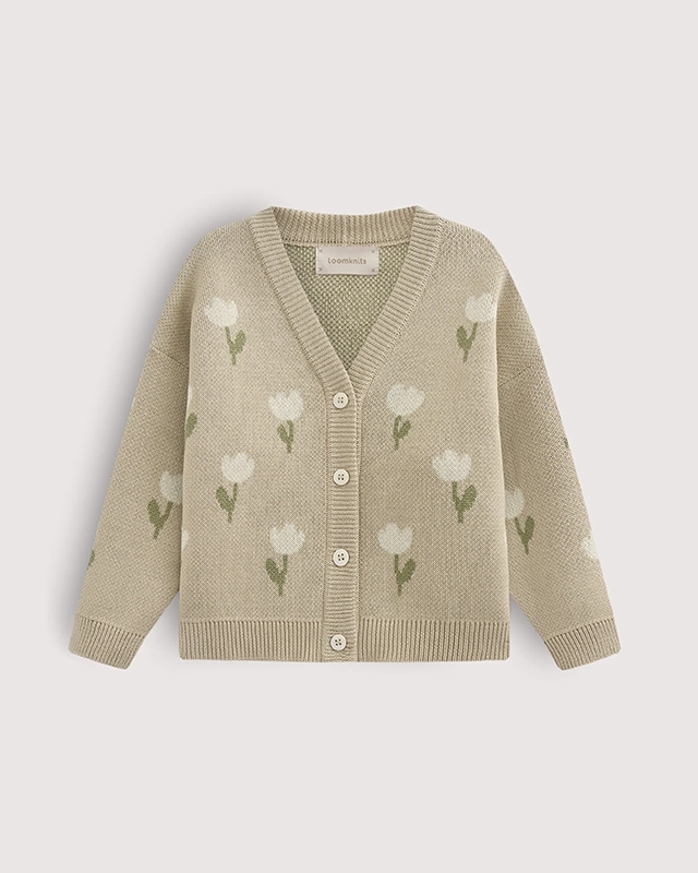 Вязаный кардиган с белыми тюльпанами словно распахивает двери в долгожданную весну — нежную и немного застенчивую.