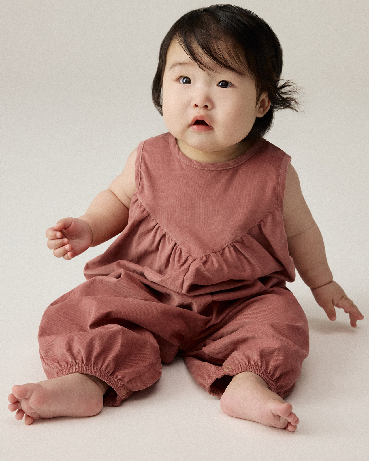 Свободный силуэт с фигурной кокеткой создает дополнительное пространство для подгузника, не ограничивая движения. Прочный микровельвет не боится активного ползания и не протирается после частой носки.