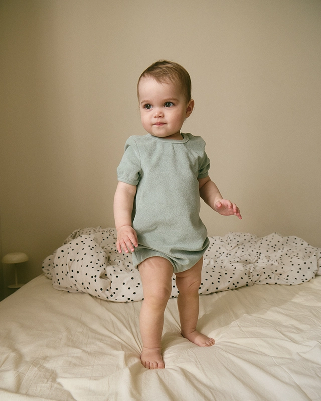 Полуприлегающий крой позволяет малышу комфортно ворочаться во сне, ползать и активно играть.