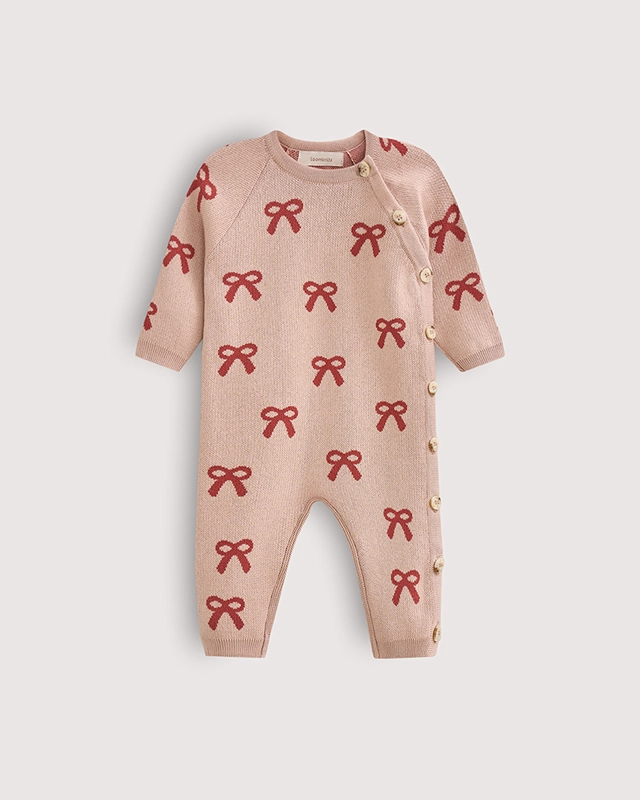 Вязаный комбинезон с красными бантиками однозначно впишется в новогодний дресс-код. Он похож на праздничную упаковку для вашего малыша, в которой появляются волшебные способности — приставучие смешинки и экстремальное уползание из-под ёлки.