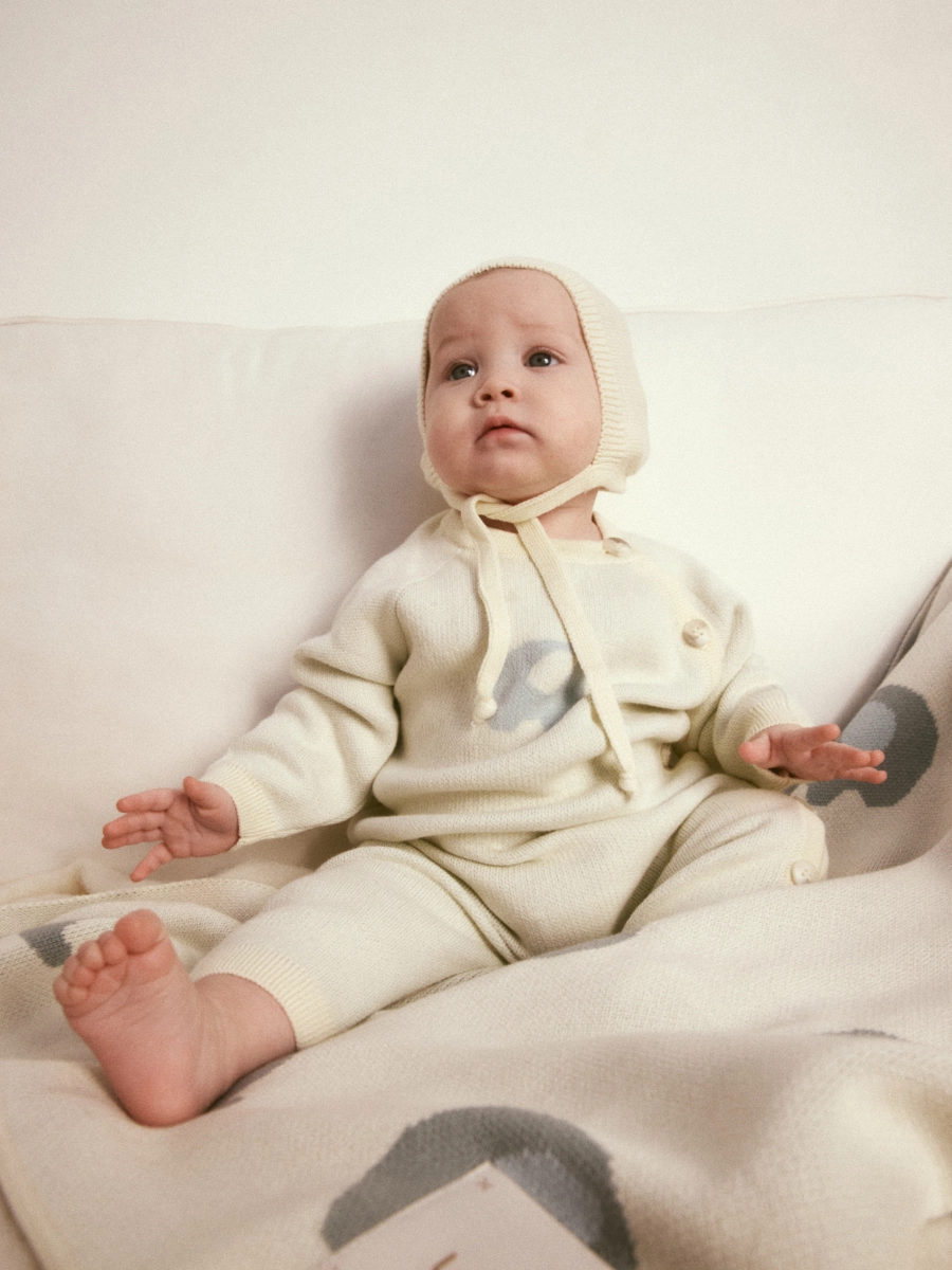 Вязаный комбинезон со слоником, который с трепетом прислушивается к сладкому сопению малыша. Эластичная ластовица, манжеты, горловина и низ штанишек позволяют свободно исследовать пространство вокруг, не натирая нежную кожу.