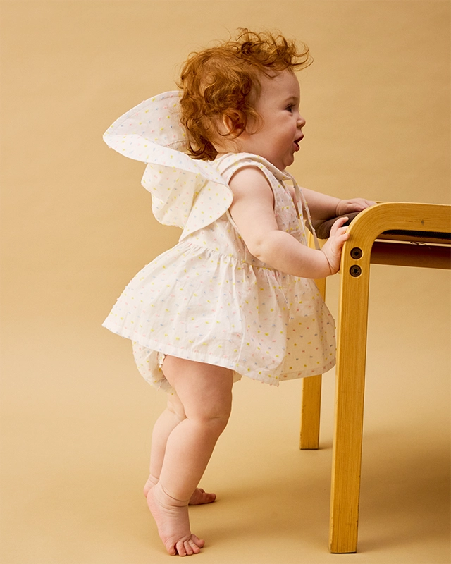 В платье без рукавов малышка сможет активно двигаться и совсем не почувствует жаркую погоду. Воротничок делает милейший образ еще более изящным, а завышенная талия создает принцессный объем.