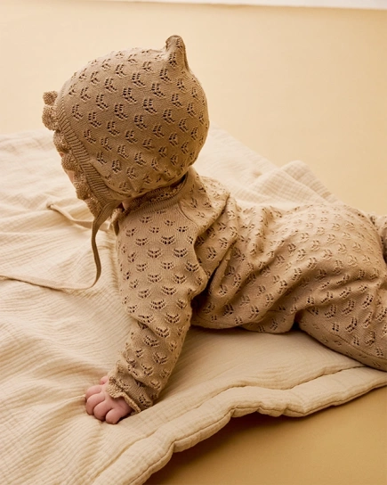 С нежной фактурой муслина, чтобы аккуратно касаться самой чувствительной кожи. Мягкой хлопковой подкладкой с фирменным принтом. Тонким слоем синтепона — надежной защитой от вечерней прохлады.