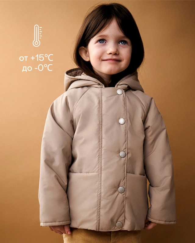 Внутри подкладочная ткань и невесомый утеплитель шелтер 60 г/м2. Температурный режим - от 0℃ до +15℃. А снаружи — глубокие карманы для хранения маленьких сокровищ.