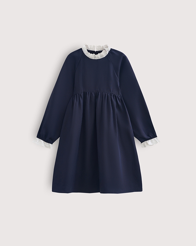Праздничные огоньки гирлянд отражаются искрящимся блеском на лиоцелле. Свободный крой с лёгкость выписывает пируэты. А нежное кружево на манжетах и воротничке «рассказывают» тёплые хроники целых поколений — когда-то такое же платье надевала бабушка, а затем и мама, довольно шагая на свой первый утренник.