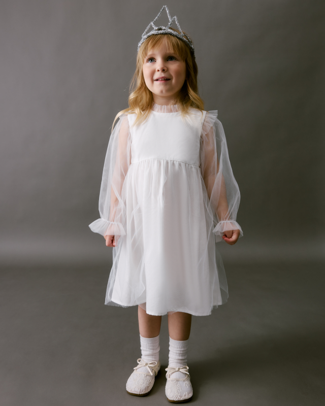 Фатиновая юбка порхает от каждого шага, создавая дополнительный объем. Прозрачные рукава с оборками на плечиках и снизу делают платье воздушным, будто сотканным из звенящего зимнего ветра.