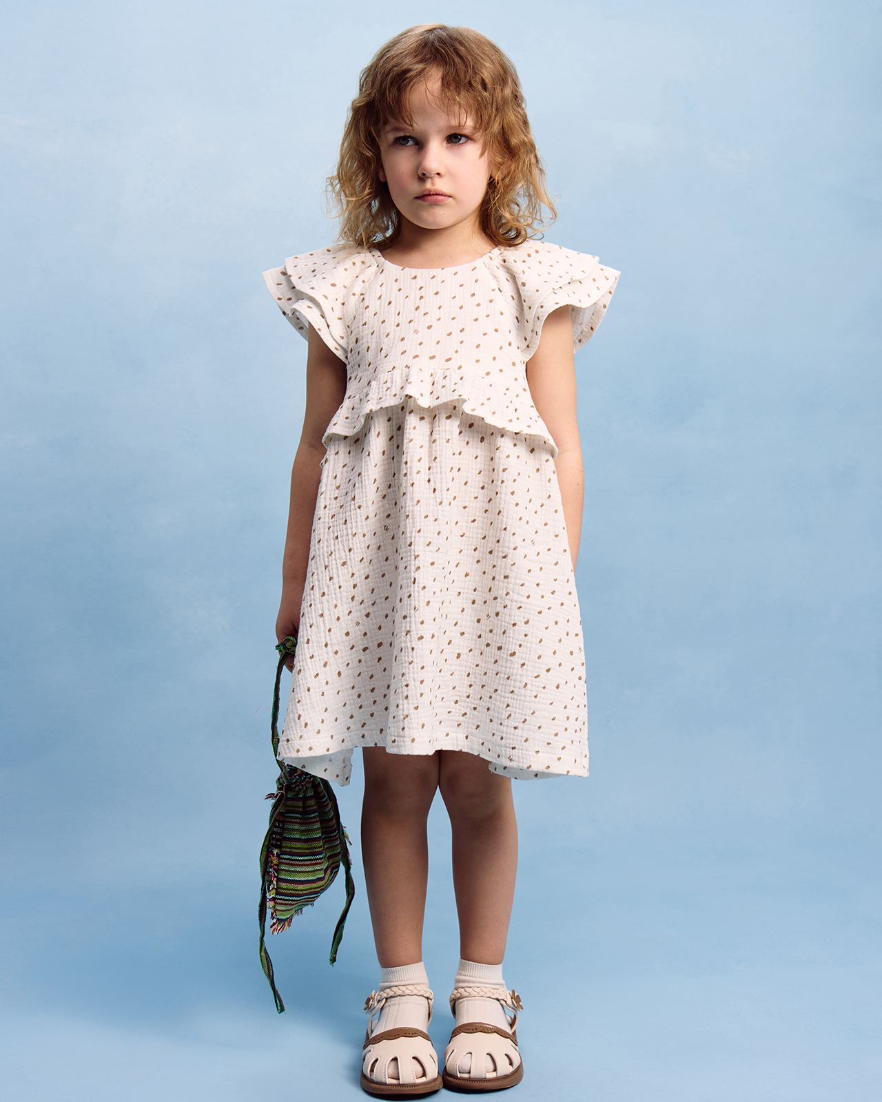 Рукава-крылышки прикрывают плечи от солнца в +25 °C, при этом оставляют руки свободными для активных движений. Рюша на талии создает дополнительный объем, чтобы красиво кружиться.