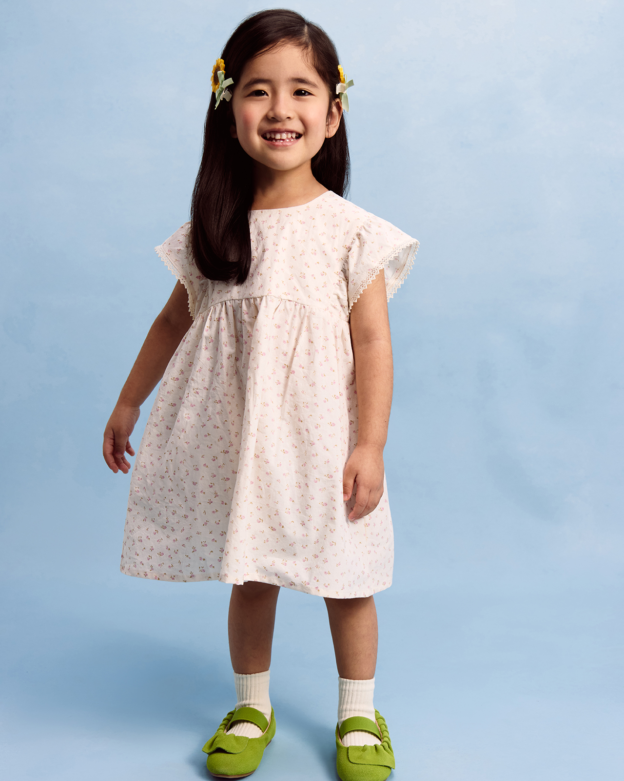 100% гипоаллергенный хлопок не дает малышке перегреться в +25 °C и остается мягким после частых стирок. Мелкий цветочный принт делает образ нежным и романтичным, а еще — легко маскирует капельки от растаявшего мороженого.