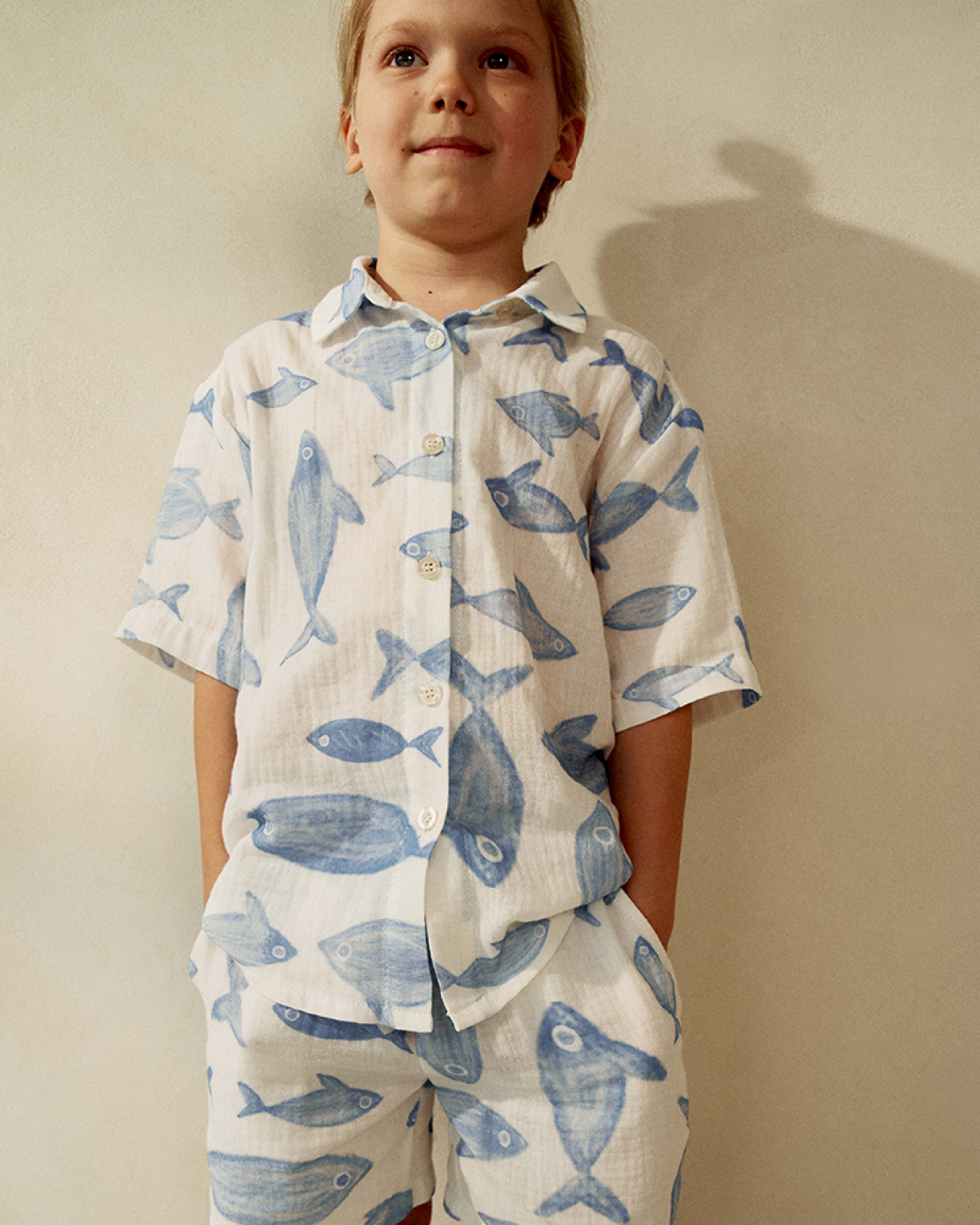 Принт с морскими рыбками создает отпускное настроение и намекает родителям, что пора отправиться в путешествие в компании панамки и шорт из комплекта.