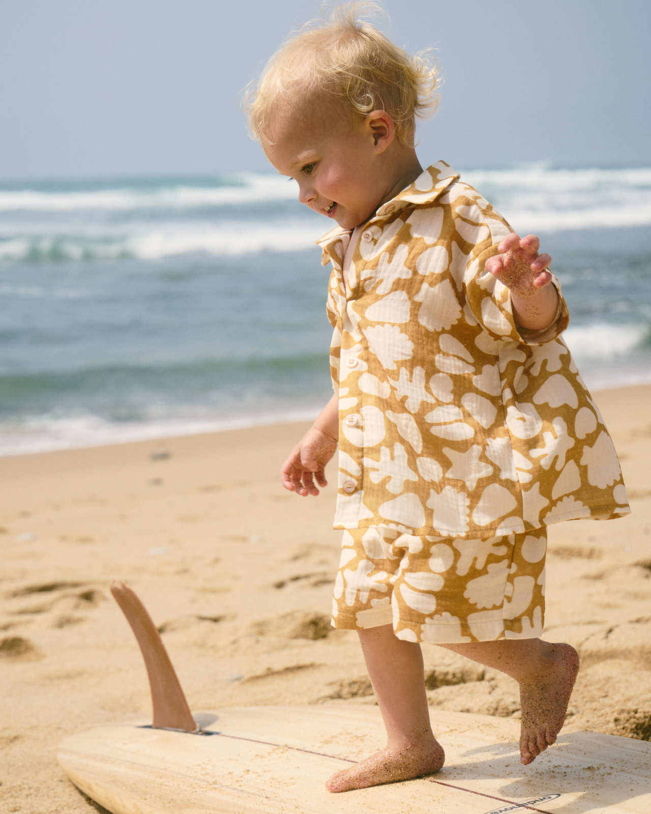 Принт с морскими ракушками создает отпускное настроение и намекает родителям, что пора отправиться в путешествие в компании панамки и шорт из комплекта.