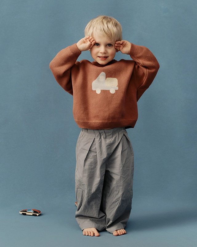 Если ребенок просит еще одно транспортное средство в свой автопарк — выберите этот вязаный свитер с машинкой.