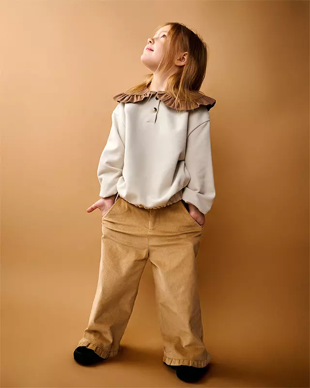 Детская толстовка с акцентным воротником. Модель изготовлена из высококачественного хлопка с добавлением полиэстера в оттенке мокко. В качестве застежки используются пуговицы. Рукава и низ изделия выполнены на резинке. Свободный крой вещи обеспечивает ребенку свободу движений во время игры или прогулки. Изюминка толстовки — контрастный круглый воротник с рюшей. Носить можно с брюками в таком же оттенке от loomknits, джинсами или юбками.